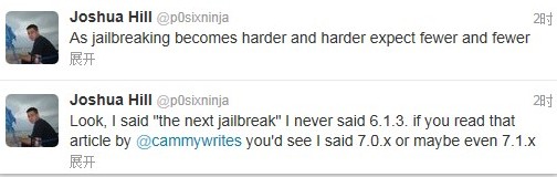 不過,p0sixninja 之前並未透露新發現的漏洞會用於哪一個版本的越獄。也許是因為有太多網友對此進行了詢問,這位前綠毒大哥今天通過 Twiiter 再一次聲明:我(之前)所說的是“下一次越獄”,並非指代 6.1.3,而是 iOS 7.0.x 甚至可能是 7.1.x。隨後 p0sixninja 還進行了解釋:因為越獄已經變得越來越難了(暗示不想讓新漏洞過早犧牲)。