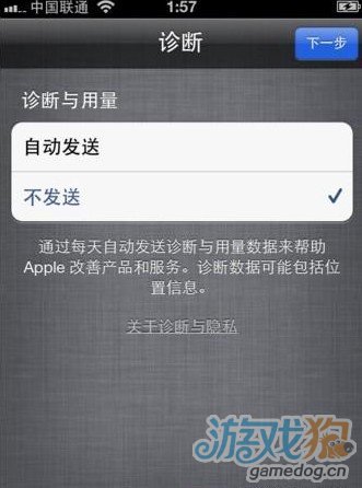 7、診斷功能,每天自動發送改善產品和服務的一些信息,這裡我們設置的不要發送,想到每天彈出很多這種信息還真的很頭疼。不過您的手機有您決定,到底要不要提醒。