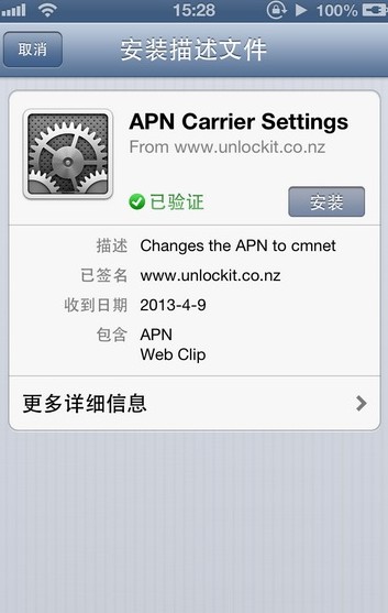 3.然後跳轉到以下界面,點擊【安裝】。然後你的iPhone桌面就會多一個APN圖標。設置—>通用—>描述文件裡也會出現“APN Carrier Settings”