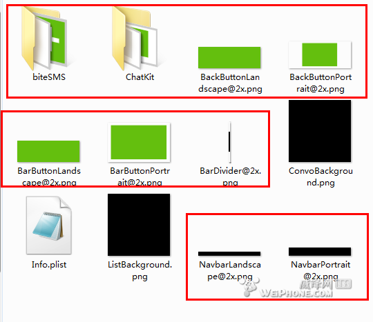 刪掉biteSMS和ChatKit文件夾,這兩個文件夾裡包含了一些氣泡圖片之類的主題素材,沒有這兩個文件夾中的素材,
