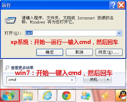1)xp系統:開始—運行—輸入cmd,然後回車 win7系統:開始—鍵入cmd,回車