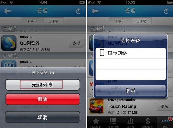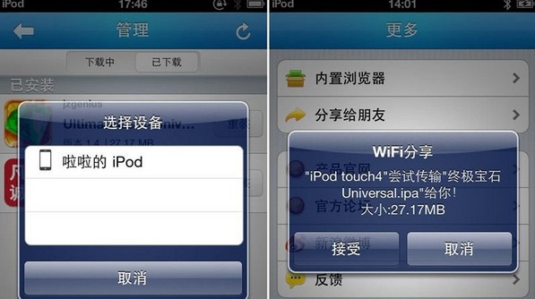 傳輸完成後,就可以安裝使用了。然後,說說“WIFI分享”的操作方法。具體步驟同藍牙分享類似。