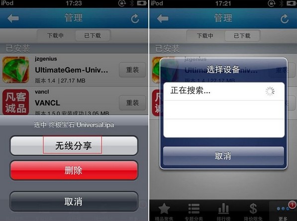 二是在“更多—管理—已下載”軟件中找到要傳輸的軟件,點擊,在彈出的對話框中選擇“無線分享軟件”。接收方接受到傳輸信息後,就可以傳輸了。(注意:兩台設備藍牙連接可能需要一定的時間,所以要耐心等待)