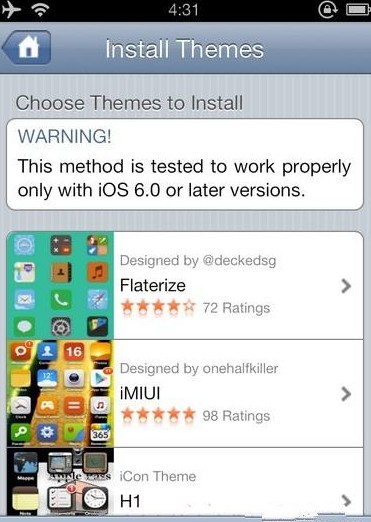 三、裡面有好幾款漂亮的主題,風格各異,選擇自己喜歡的一款並點擊之。(頁面上方的警告大意為僅在 iOS 6 或更高版本測試通過。相信大多數人已經升級到 iOS 6,這個問題不大。)
