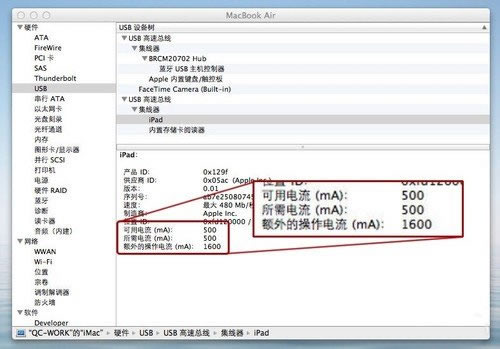 我們看下面這張圖,這是通過Mac OS系統檢測到iPad連接到USB端口上,系統檢測出iPad所需要的最低電流保障。清楚的顯示500mA。這正是USB 2.0端口的基本輸出電流。
