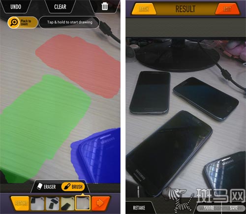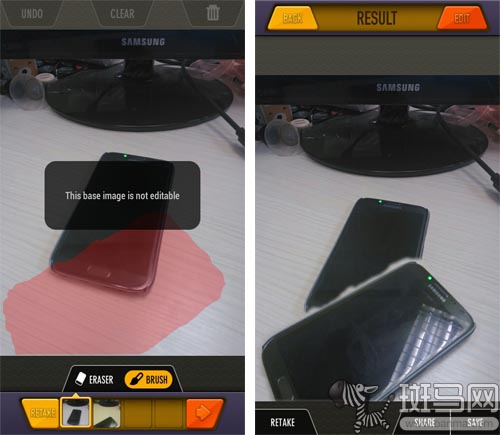 拍攝部分完成後,會自動進入後期編輯頁面。依次點選第二至第四張照片,在照片的克隆目標部分長按屏幕,聽到“叮”的一聲提示音後,用手指將目標部分塗抹選中。被選中的部分會被紅色區域覆蓋。塗抹部分可以稍稍超出目標區域,但不要有漏選的角落,不然會出現不好的合成效果。不過還是建議盡可能通過縮放以及“橡皮擦”等操作,盡量使選區准確,以保證更完美的合成效果。