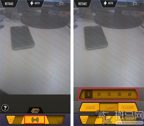 此外,在拍攝界面,可以通過點擊左下角的“齒輪”按鈕更改拍攝方式。這裡有計時拍攝和聲控拍攝可選,方便一個人的時候進行趣味自拍。
