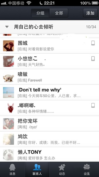 多了附近的群,還有一個大家關心的,好友離線狀態,這次真的不一樣了。離線的好友是雖然還是彩色,但是多了一層白色了,感覺顏色淡了 這樣還是容易區分的