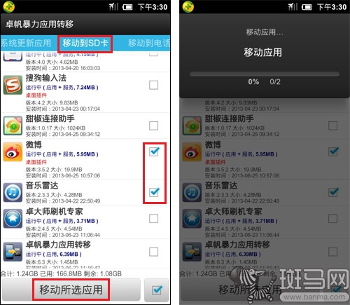以《卓帆暴力應用轉移》為例,在取得手機root權限之後,打開該應用,可以看當前手機中已安裝的應用列表。列表中除了各應用的名稱之外,還有應用版本號、大小、安裝時間等詳細信息。對於那些我們想要轉移至SD卡的應用,只要一一將其勾選,然後點擊下方的“移動所選應用”按鈕,稍等一會,這些應用就會自動被轉移至SD卡中了(期間可能會有提示詢問是否允許該應用獲取權限,需要允許該操作)。不論是新浪微博客戶端還是360手機助手,都可以成功轉移到外置SD卡中,甚至連這款應用本身也可以同樣轉移出來並且不影響正常使用。