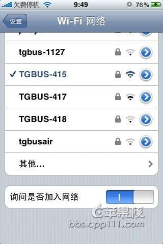 進入設置Settings->WiFi,iPhone會自動搜索區域內可見的接入點,顯示如下: