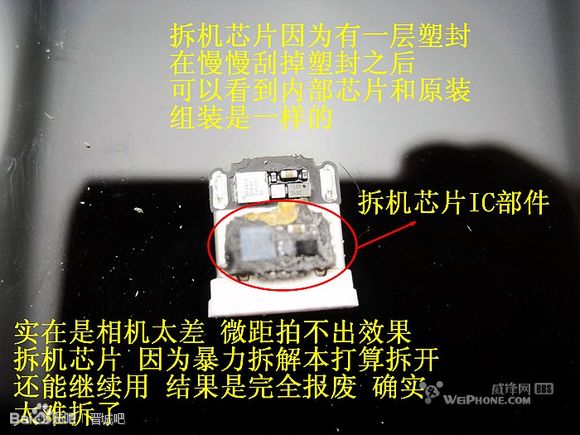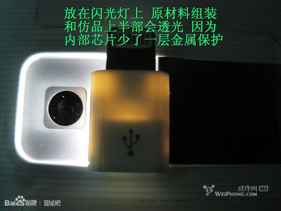 外觀上只有二點能看出來是不是原配的,第一就是原膜,原配的原膜是透明圓邊,原材料組裝的是磨砂膜,有藍邊,淡藍邊、黃邊有的商家會揭掉原膜。第二就是插頭,原配的基本沒任何晃動,原材料組裝的晃動比較的明顯。當然我們看是不是機器原配的,也不能直接就拆開看,但是有一個方法,之前威鋒上也有人說過,沒錯就是放到手機閃光燈上,原配的因為內部芯片有金屬保護層,所以中間是不透光的,2邊略有一點透光。原材料和精仿的放在閃光燈上,上半部基本上全透光的。 放閃光燈前必需揭掉原膜,不然看上去是膜全閃光,下面圖片是晚上全黑的背景下拍的,所以透光效果會比較明顯。白天透光效果要弱一些