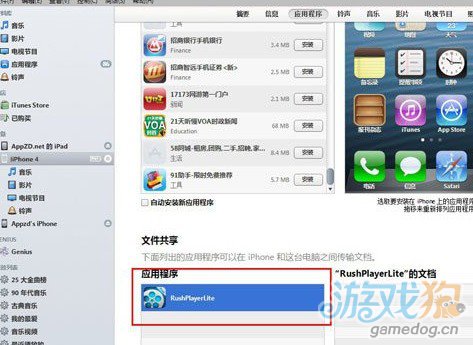 打開iTunes,用USB線將設備連接上電腦,選擇RushPlayer,在文檔中點擊添加按鈕: