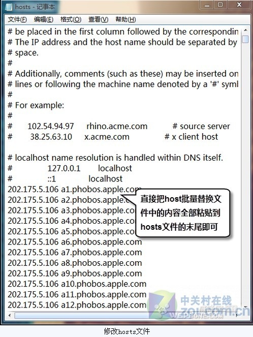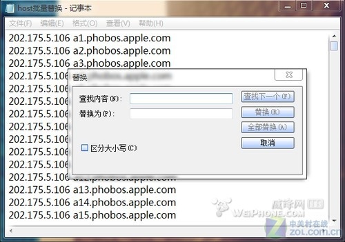 之前我們提到了iTunes請求的下載服務器域名是在a1-a2000之前浮動的一個地址,所以我們要建立2000個映射,當然一個一個輸入太麻煩了,在壓縮包中有一個批量替換用的文本本件。