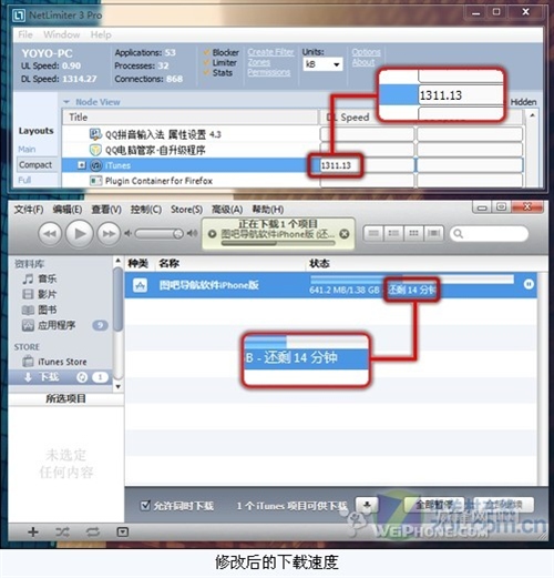 我們之前做了這麼多到底效果怎麼樣呢?俗話說是騾子是馬拉出來溜溜,我們還是用真實的下載記錄圖片來說明一下吧。我們選擇NetLimiter作為輔助軟來查看一下iTunes的真實下載速度。