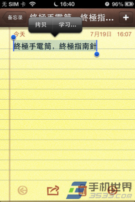 4)注意簡體繁體轉換需要在編輯狀態下,當屏幕中有虛擬鍵盤,意味著處於編輯狀態。只有在編輯狀態下才能喚出“替換為…”對話框,不然當選中文字之後,只有拷貝跟學習。(如下圖所示)