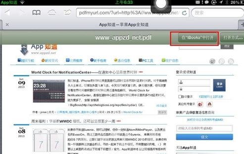 8.在PDF中以“iBooks”的方式打開,這時就會PDF也會默認保存到iBooks中,以後可以隨時通過“iBooks”觀看這個網頁了。