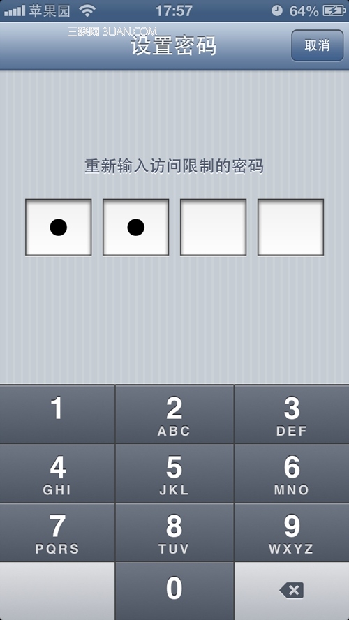 第5步:由於“訪問限制”權限很大,將影響到很多重要的設置,所以為了安全起見蘋果強制要為其設置四位數字密碼。按小鍵盤可輸入密碼,為防止旁邊有人偷窺,密碼在手機上將統一以點顯示;