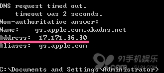 從開始菜單裡的“運行”中輸入cmd,打開命令行窗口,打開後輸入命令“nslookup gs.apple.com”,則會找到了你地區訪問gs.apple.com所得到的真實ip,記下你的IP(標記紅色),如: