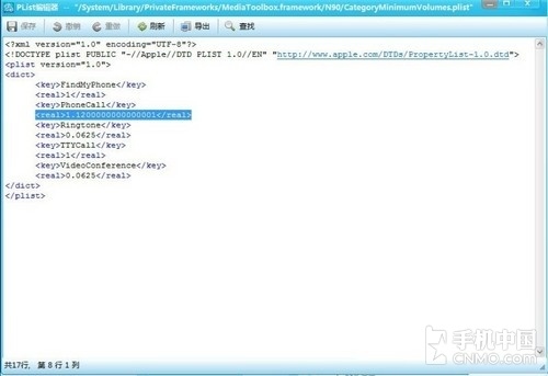 圖中,藍色框選中的部分, 原先數值為0.0625,我們可以把它修改成 “1.1200000000000001”,“Phonecall”的意思就是通話時候的音量,把它的最小通話音量增加一些即可。例如增加到 “1.12”,實際證明不會影響喇叭的壽命。修改完之後記得要保存,然後重啟手機。待開機之後,各位再去試試吧。