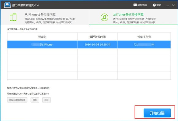 3、運行強力蘋果恢復精靈,點擊軟件界面的“從iTunes備份文件恢復”按鈕,軟件會主動將我們利用iTunes軟件的數據掃描出來,我們確定需要掃描的數據後,點擊“開始掃描”按鈕對數據進行掃描。