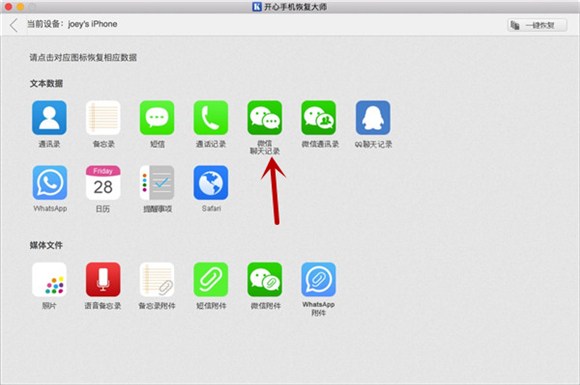 Step 3 :然後我們就進入到數據恢復的主界面,我們可以看到開心手機恢復大師Mac版本支持恢復蘋果手機的數據類型有很多,包括微信聊天記錄、短信、備忘錄、通話記錄、照片、通訊錄等。我們要恢復蘋果手機刪除的微信聊天記錄,所以我們點擊【微信聊天記錄】圖標。