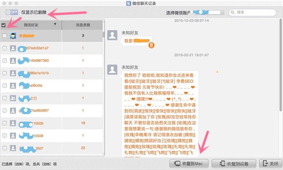 Step 5 :掃描完成後,我們即可預覽到掃描結果。掃描出來的微信聊天記錄數據以兩種顏色區分顯示;黃色的表示已經刪除的微信聊天記錄;黑色的表示未刪除的微信聊天記錄。我們可以點擊【僅顯示已刪除】按鈕,幫助我們快速篩選要恢復的微信聊天記錄。在對應微信聊天記錄左側方框中勾選,點擊【恢復到Mac】即可將誤刪除的微信聊天記錄恢復到電腦相應的保存路徑中,並且是可以直接查看的。