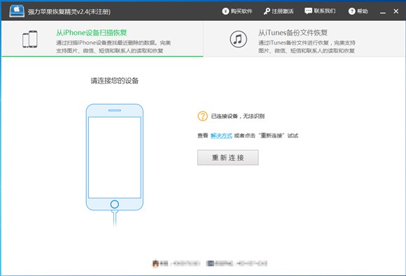 2、用USB數據線將蘋果手機和電腦進行連接,然後運行強力蘋果恢復精靈來恢復丟失的手機通訊錄。如果沒有顯示手機數據,出現如圖界面,表示沒有連接成功,可以刷新使連接成功。