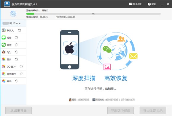 4、軟件對蘋果手機數據深度掃描之時,我們無需任何操作,更不要拔掉手機,中斷掃描。