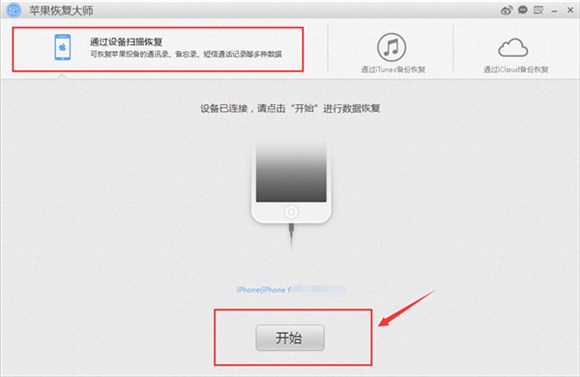 第三步、運行蘋果恢復大師(www.ifonebox.cn),我們使用默認的【通過設備掃描恢復】進行演示,所以當看到軟件提示“設備已連接”則表示設備已經被軟件識別到了,點擊【開始】即可進入iPhone微信聊天記錄恢復模式;