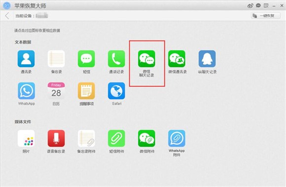 第四步、跳轉進入數據項圖標界面之後,看到的數據項均為蘋果恢復大師支持恢復的數據,我們想要找回蘋果手機微信聊天記錄,所以直接點擊【微信聊天記錄】驅使系統自動分析和識別手機中的微信數據;如果是想找回微信圖片、語音、小視頻,則點擊【微信附件】;