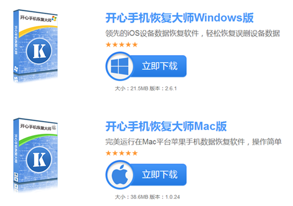 第一步:首先要在電腦上下載開心手機恢復大師,這是專業蘋果數據恢復軟件,以此來查看已刪除的微聊天記錄再合適不過了,下載的時候要區分版本下載:Mac(蘋果電腦)系統下載Mac版本;Windows系統下載Windows版本。