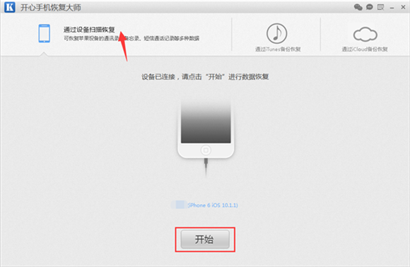 第二步:運行開心手機恢復大師。我們可以看到,該工具提供三種恢復方式,可以來幫助我們恢復蘋果手機數據。我們點擊選擇“通過設備掃描恢復”,以此模式來查看微信刪除的聊天記錄。將iPhone手機通過數據線連接電腦,然後等待開心手機恢復大師識別。識別讀取完成後,軟件會顯示設備信息,然後點擊“開始”