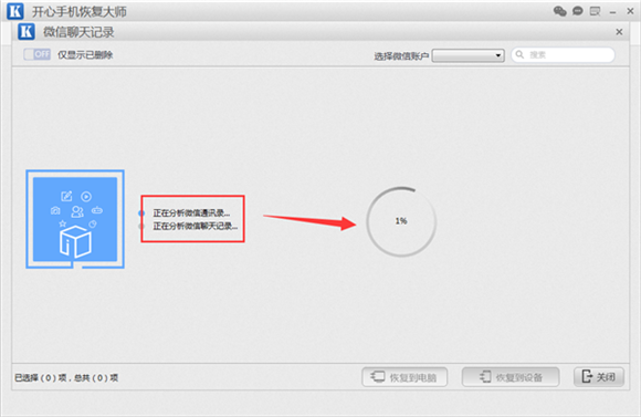 第四步:然後開心手機恢復大師開始深層次的掃描分析,iPhone手機中的微信聊天記錄數據文件。掃描過程需要5分鐘左右。