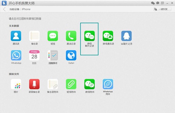 步驟四、跳轉進入數據項圖標界面,可以看到軟件支持恢復的17種常用數據對應的圖標,我們需要備份蘋果手機中的微信聊天記錄的話,點擊【微信聊天記錄】即可驅使系統進入自動分析和識別手機內存中的微信數據的狀態;