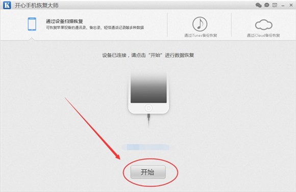 第二步:把自己的iPhone連接到電腦上,如果手機是第一次連接到電腦,那麼我們需要在手機上點擊信任進行信任電腦的操作。當軟件顯示“設備已連接”時,說明手機已經正確連接到電腦,然後我們點擊“開始”進入已刪除短信的恢復模式即可;