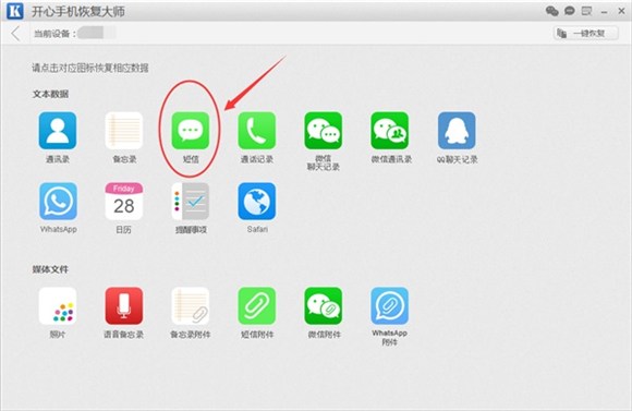 第三步:在數據恢復模式,我們可以看到開心手機恢復大師不但可以恢復刪除的短信,還能恢復刪除的通訊錄、微信聊天記錄、qq聊天記錄等數據。今天教大家的是如何恢復蘋果手機刪除的短信,所以我們找到“短信”圖標,並點擊。點擊之後,開心手機恢復大師會對手機內的短信數據進行掃描和分析,請耐心等待;