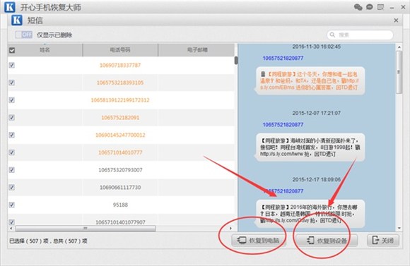 第四步:大概經過了3分鐘,掃描結束後,開心手機恢復大師進入短信數據的預覽界面。在這個界面,我們可以看到手機內已刪除的和未刪除的短信;其中橙色是已刪除的短信,黑色是未刪除的短信;