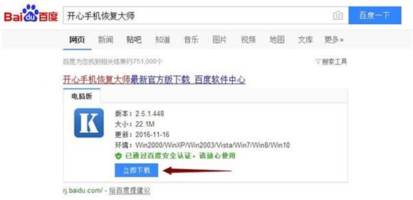 第一步、想要找回不小心刪除的微信聊天記錄的話,先把微信數據恢復軟件——開心手機恢復大師(官網:http://www.kxbox.com/)下載到電腦上,下載方式多種多樣,直接百度“開心手機恢復大師”點擊“立即下載”就可以;