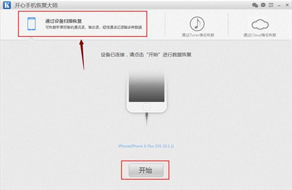 第二步、安裝完成就可以運行軟件了,我們可以看到主界面上有三種不同的恢復方法,默認為【通過設備掃描恢復】模式,所以當我們看到“設備已連接”的字眼之後,就可以點擊【開始】進入微信聊天記錄恢復模式了;