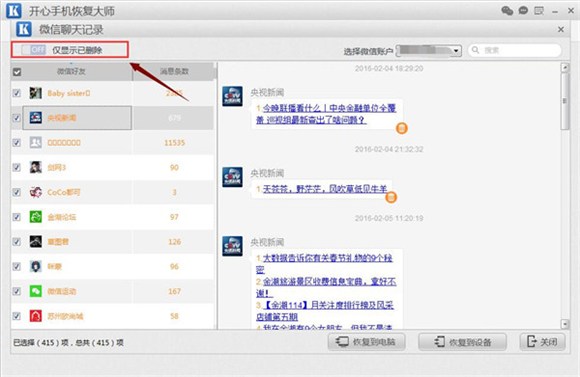 第五步、掃描結束即可預覽到結果,我們可以看到系統將掃描到的微信聊天記錄分為橙色和黑色;橙色的是已刪除的微信聊天記錄,而黑色的則是未刪除的微信聊天記錄,點擊【僅顯示已刪除】可進行切換查看;