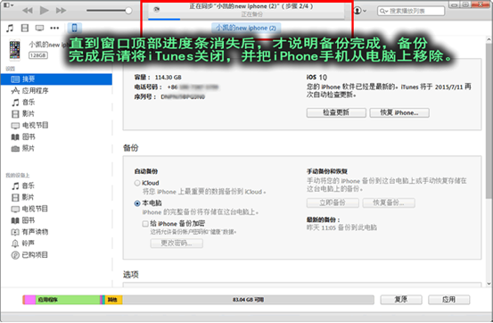 3,備份會將手機上的所有文件進行壓縮打包,然後傳輸到電腦上,因此通常需要比較久的時間。備份結束後,請將iTunes軟件關閉,並從電腦上移除手機。