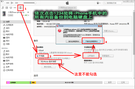 2,在電腦上打開並安裝iTunes軟件,然後按下圖所示操作順序,將iPhone手機中的所有文件備份到電腦上。