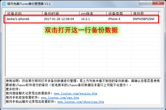 4,接下來安裝並打開“樓月免費iTunes備份管理器”(樓月軟件官方下載地址:http://www.louyue.com/itunes.htm),雙擊彈出窗口上看到的那一行備份數據。