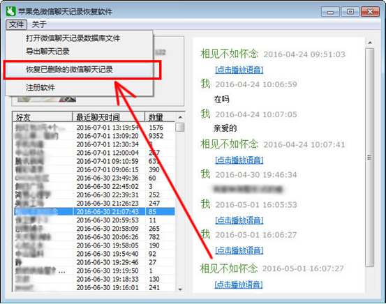8,軟件主面板上就可以查看到與所有好友的微信聊天內容了。我們還需要進行如下操作:點擊“文件”“恢復已刪除的微信聊天記錄”菜單。