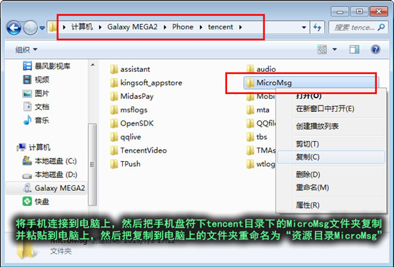 6,把安卓手機再次連接電腦,並進入手機所在盤符,然後把手機盤符根目錄下的MicroMsg文件夾也復制並粘貼到電腦上,復制後請對其進行重命名,如下圖說明文字所示操作。