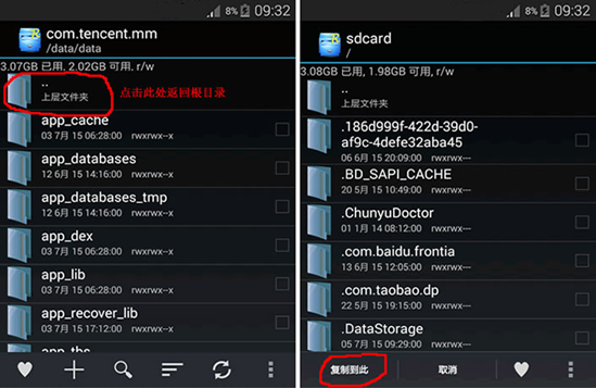 5,點擊頂部的..圖標(需要點擊多次),直到返回到根目錄。在根目錄下進入sdcard文件夾後,點擊左下角的“復制到此”圖標。