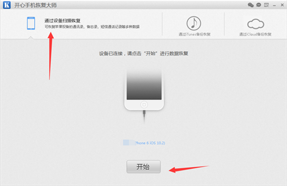 第二步:運行開心手機恢復大師,我們可以看到作為專業的技術型恢復軟件,開心手機恢復大師共提供三種恢復模式幫助我們恢復蘋果手機刪除的數據。我們點擊選擇“通過設備掃描恢復”,以此模式為例,教大家如何恢復微信刪除的聊天記錄。把我們的蘋果手機通過數據線,連接到電腦,然後開心手機恢復大師會識別讀取設備信息,識別完成後,我們點擊“開始”。