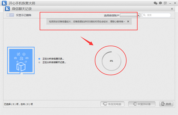 第四步:然後進入到掃描階段,開心手機恢復大師開始深度掃描分析蘋果手機中的微信聊天記錄數據,此過程是恢復微信刪除聊天記錄的重要步驟,此階段保持手機與電腦的穩定連接,並且不再操作微信。