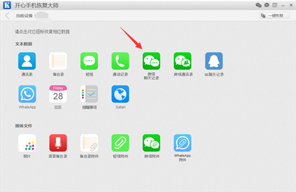 第三步:點擊“開始”後,界面跳轉到數據恢復的主界面。在數據恢復的主界面我們可以看到:通訊錄、短信、備忘錄、照片、微信聊天記錄等許多蘋果手機數據均支持恢復。如何恢復微信刪除的聊天記錄?我們點擊“微信聊天記錄”圖標。
