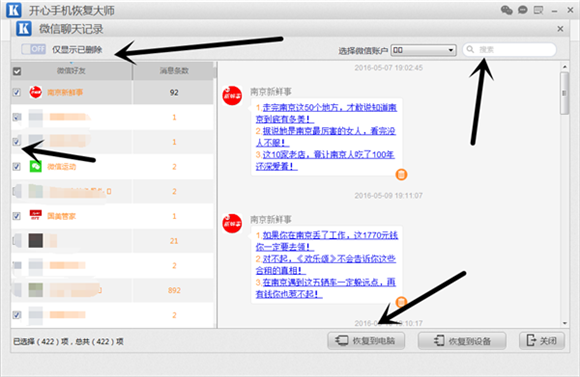第五步:掃描完成後跳轉到微信聊天記錄預覽界面。掃描出來的微信聊天記錄以兩種顏色區分顯示。微信聊天記錄刪除了怎麼恢復?我們可以點擊“僅顯示已刪除”在黃色部分,查找我們要恢復微信刪除的聊天記錄。然後在對應微信聊天記錄前勾選,點擊“恢復到電腦”即可。